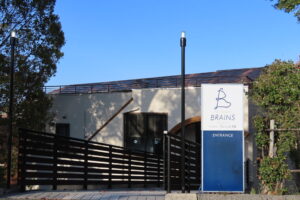 かわいいロゴの建物、右奥のドアからお部屋に入ります。