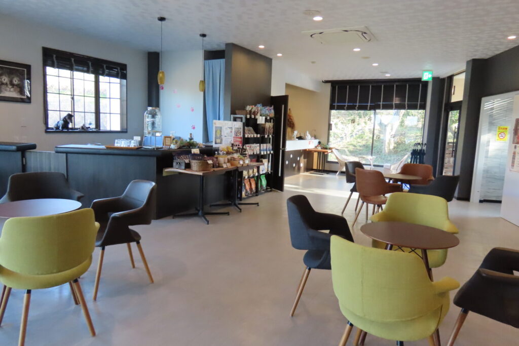 フロントやお土産コーナー、くつろげるテーブル席など色合いがステキです。