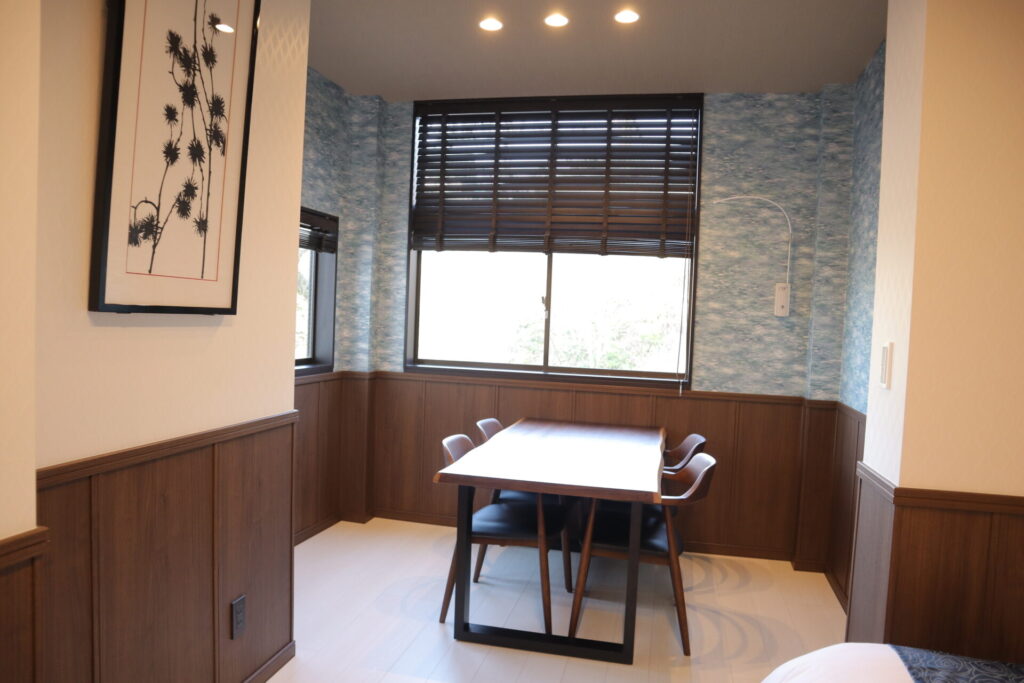 ベッドの奥にはダイニングテーブルがあり、ここで部屋食が提供されます。