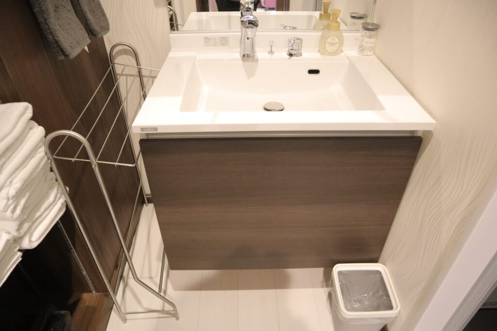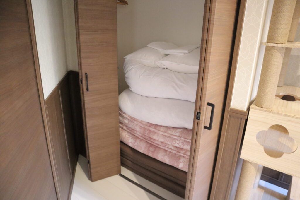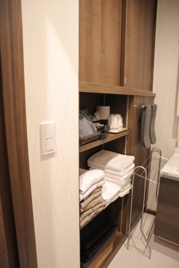 棚には、タオルやアメニティセット、パジャマが人数分用意されています。