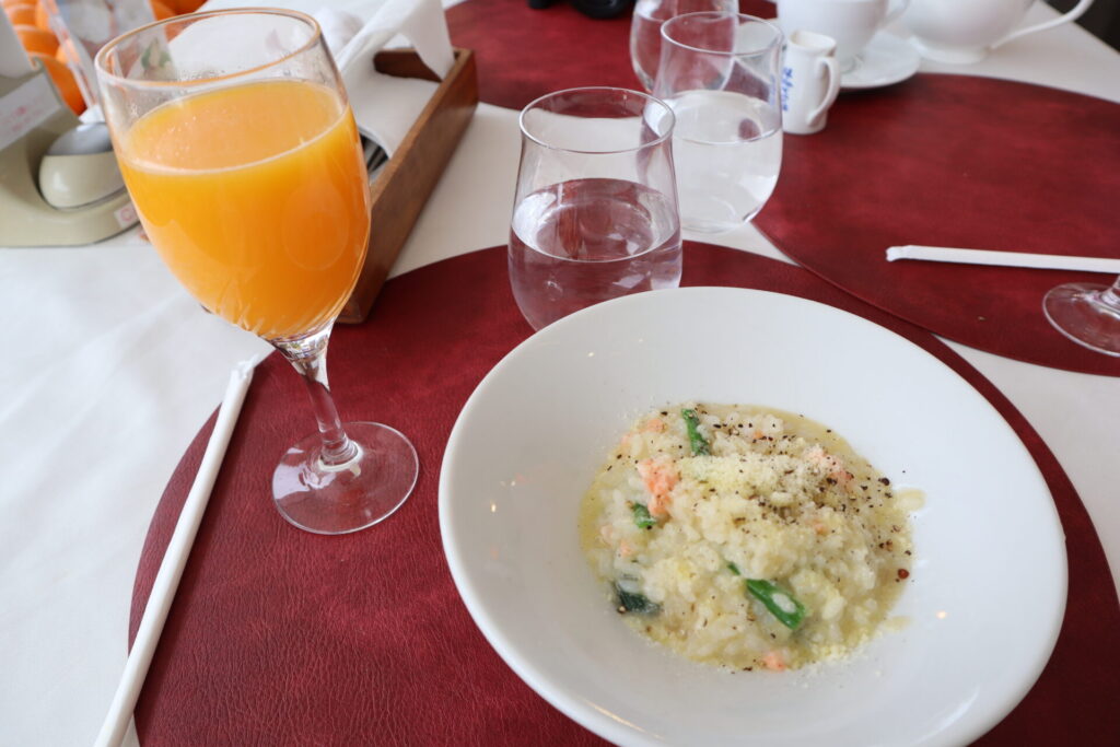 セットドリンクはオレンジジュースを選び、しぼりたて生ジュースで果実そのままの味がして美味しい!